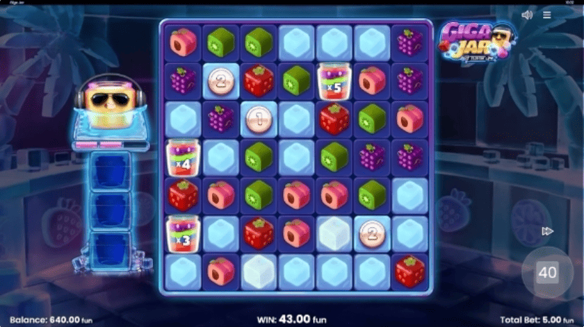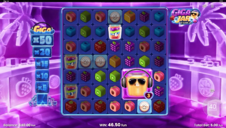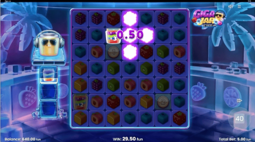 Giga Jar Cluster Link offers six regular pay symbols, all displayed in a cuboid shape and representing various fruits. From lowest to highest value, players can expect to find a berry, grapes, kiwifruit, an apricot or stone fruit, an orange and a strawberry. A cluster of five identical symbols is worth between 0.1 to 1 times the bet, while a cluster of 16 or more symbols can award players between 10 to 500 times their stake.
