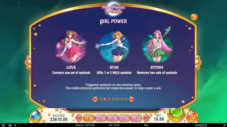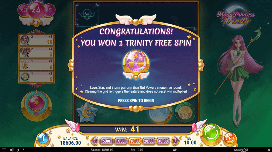 To trigger the Trinity Free Spin feature in Moon Princess Trinity, players must fill the golden meter located to the side of the reels with six segments. Landing a 3, 4 or 5-of-a-kind princess symbol win fills 1, 2 or 3 segments, respectively. Once the meter is completely filled, players will be awarded one free round of Trinity Free Spins, where Love, Star and Storm each perform their respective Girl Powers.