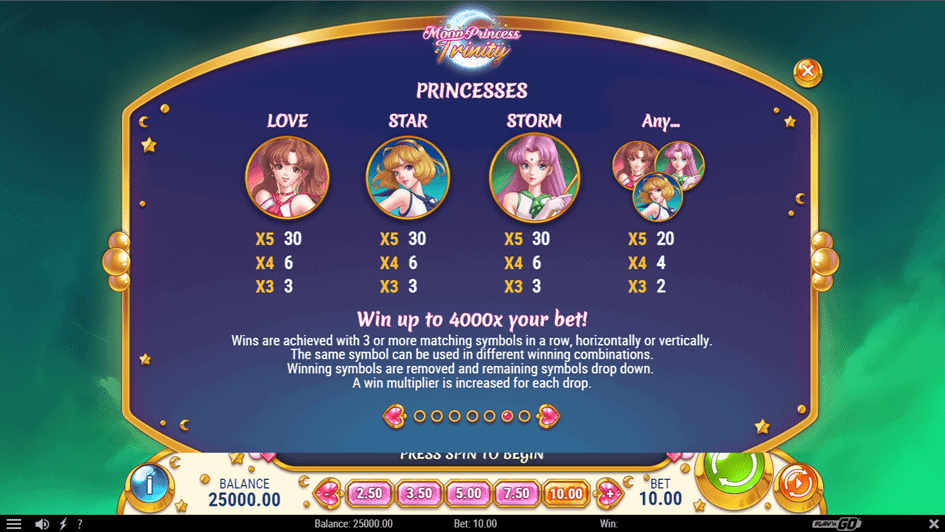 Moon Princess Trinity is an exciting free online slot game created by Play’n Go. This game takes players on an epic adventure through a mystical world of magic, moonlight and princesses. With its engaging theme, stunning graphics and immersive sound effects, Moon Princess Trinity offers players an unforgettable gaming experience.