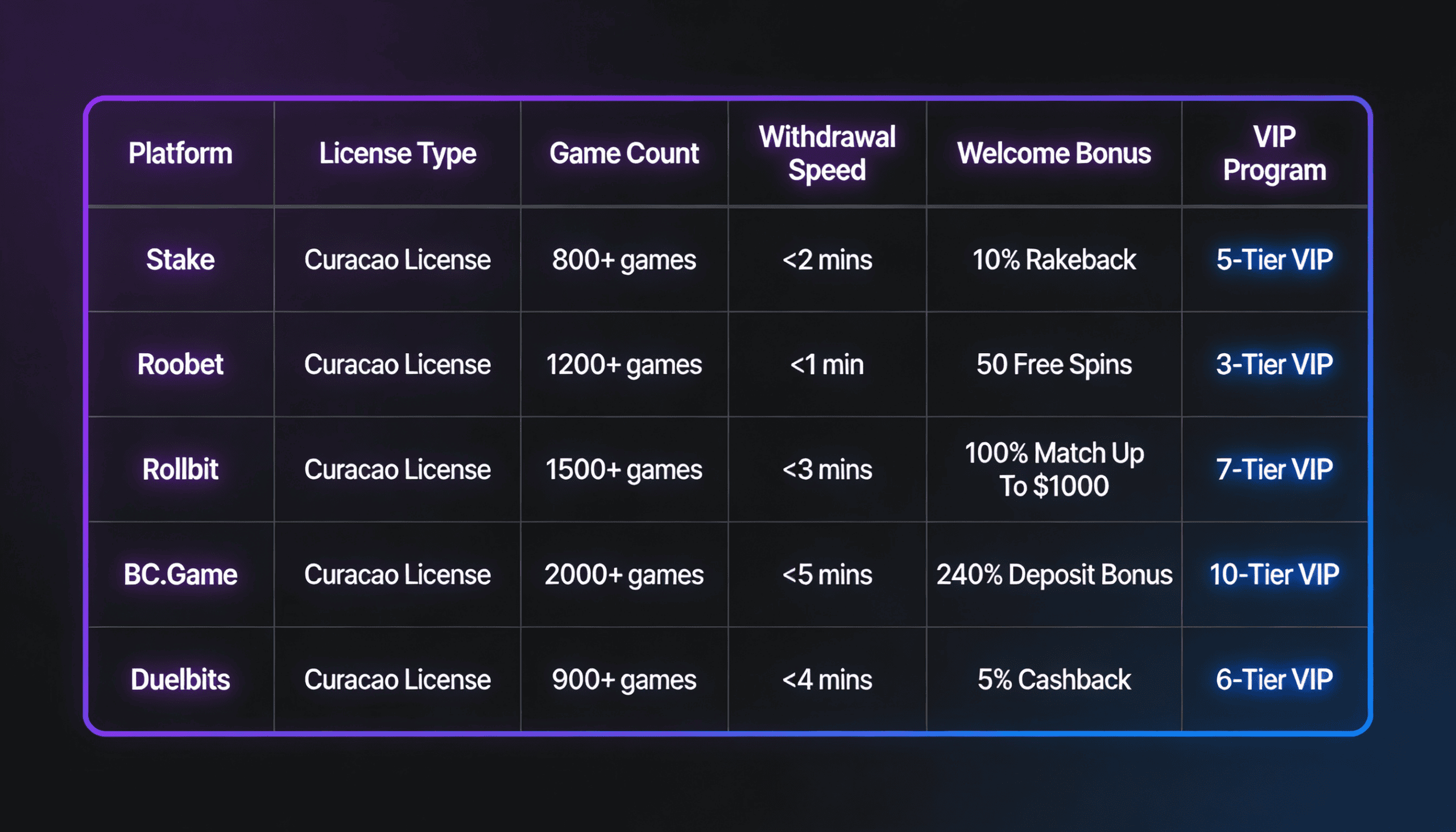 | Platform | License Type | Game Count | Withdrawal Speed (Crypto) | Welcome Bonus | VIP Program |