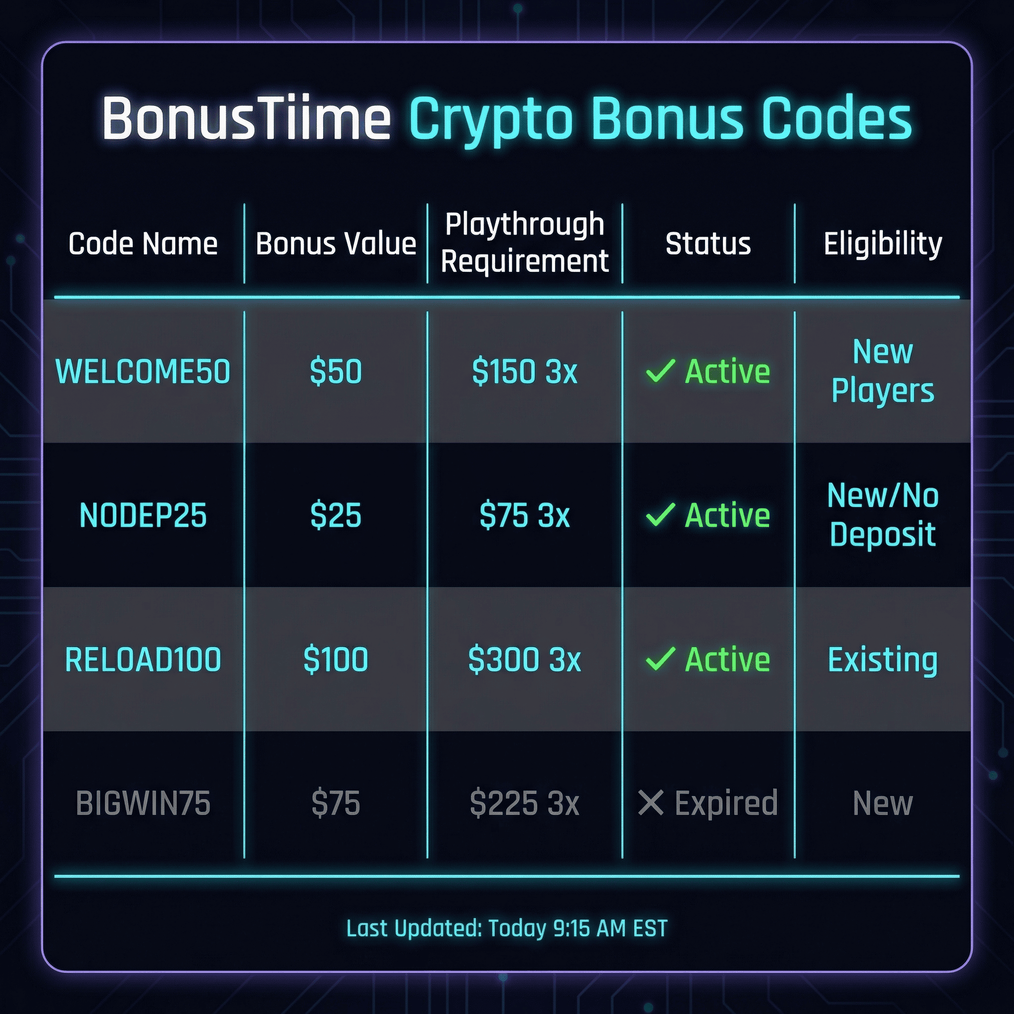 Current working bonus codes with verified values, exact playthrough requirements in dollars, and state eligibility. Table updates daily. Only includes codes confirmed active today.