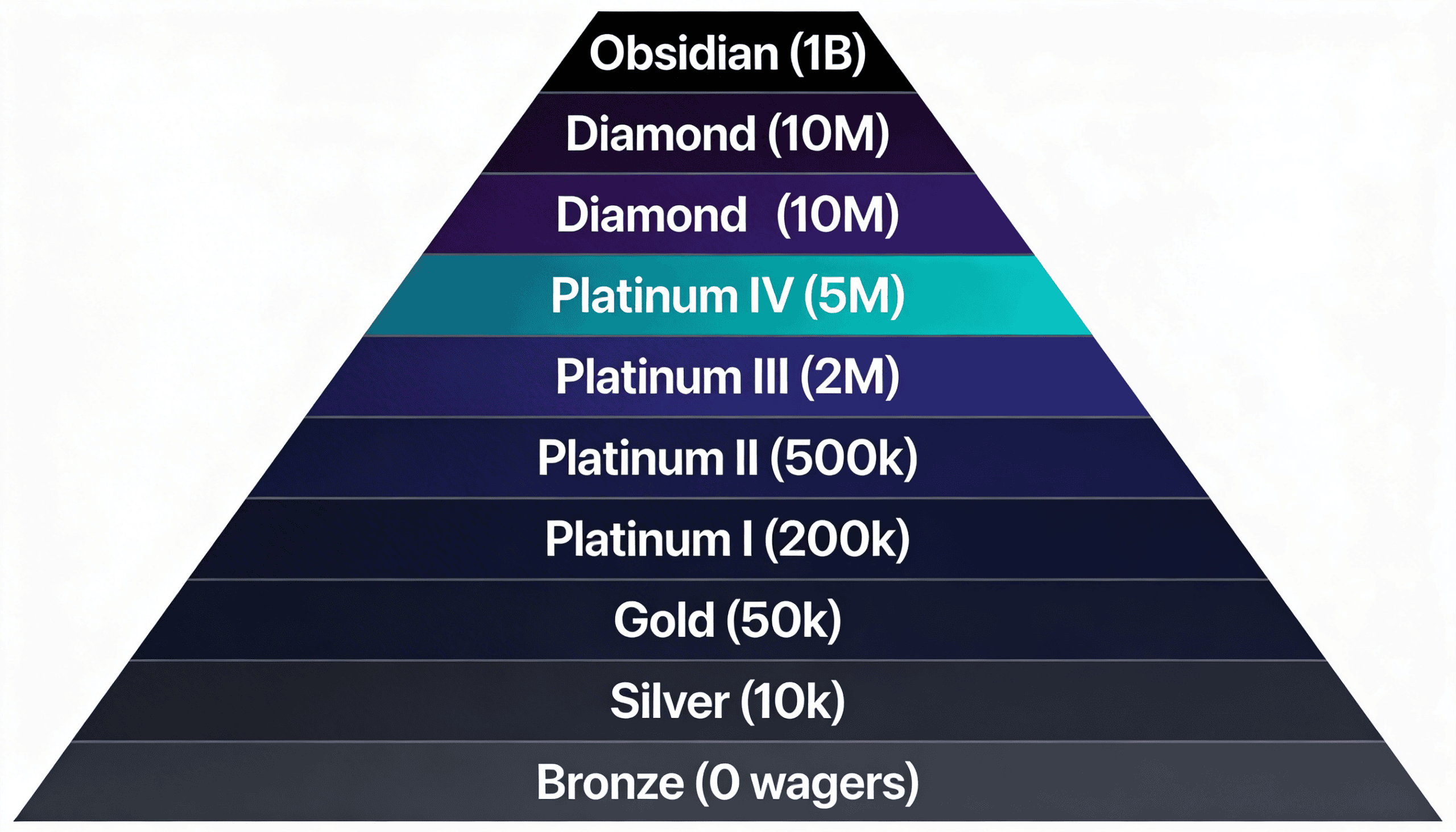 Bronze (0), Silver (10k), Gold (50k), Platinum I (200k), Platinum II (500k), Platinum III (2M), Platinum IV (5M), Diamond (10M), or Obsidian (1B).