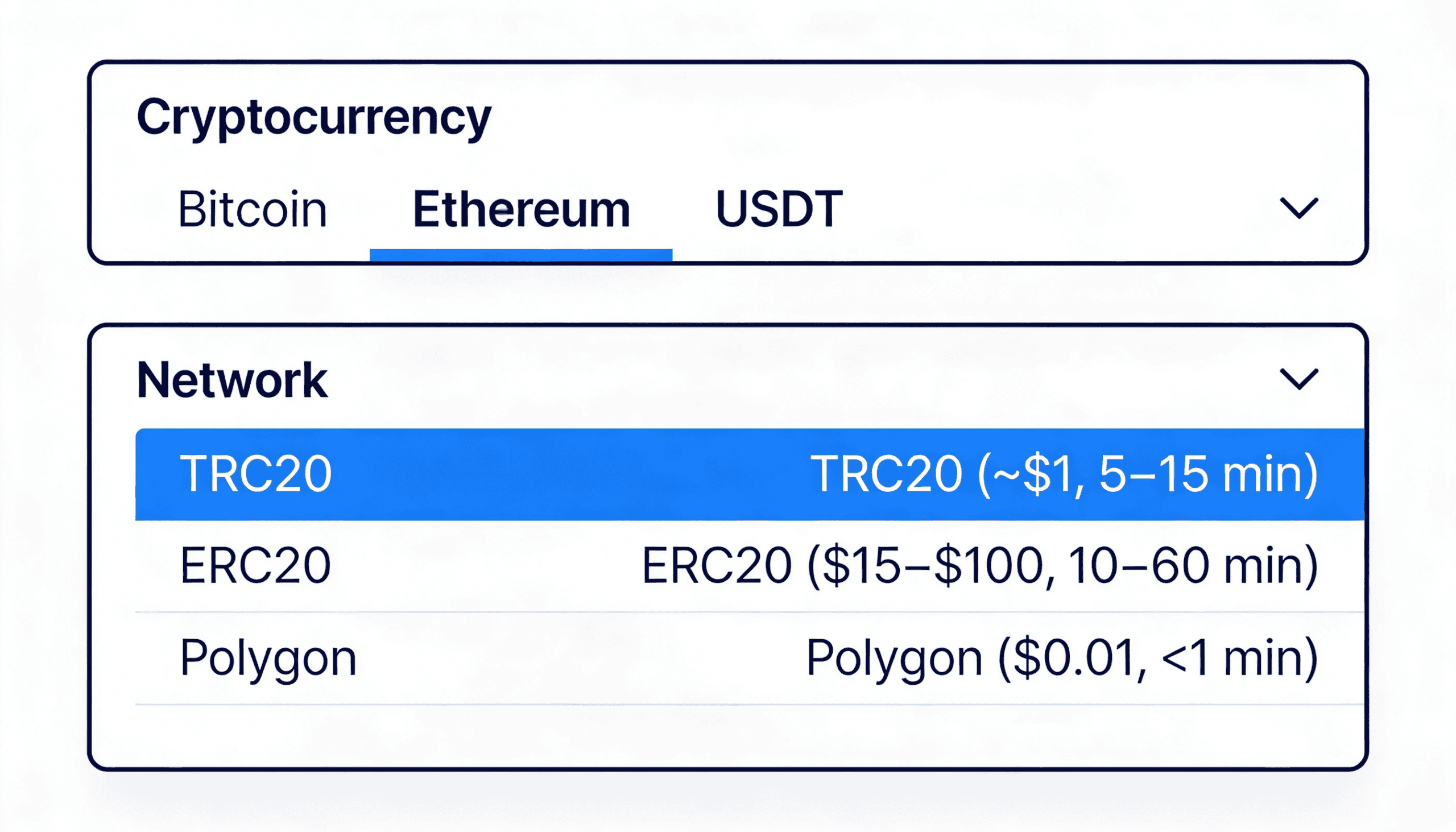 | USDT | TRC20, ERC20, Polygon | $0.10–$0.50 (TRC20), $15–$100 (ERC20), $0.01–$0.10 (Polygon) | 5–15 minutes (TRC20), 10–30 minutes (ERC20), <1 minute (Polygon) | TRC20: best value. Polygon: balanced. |
