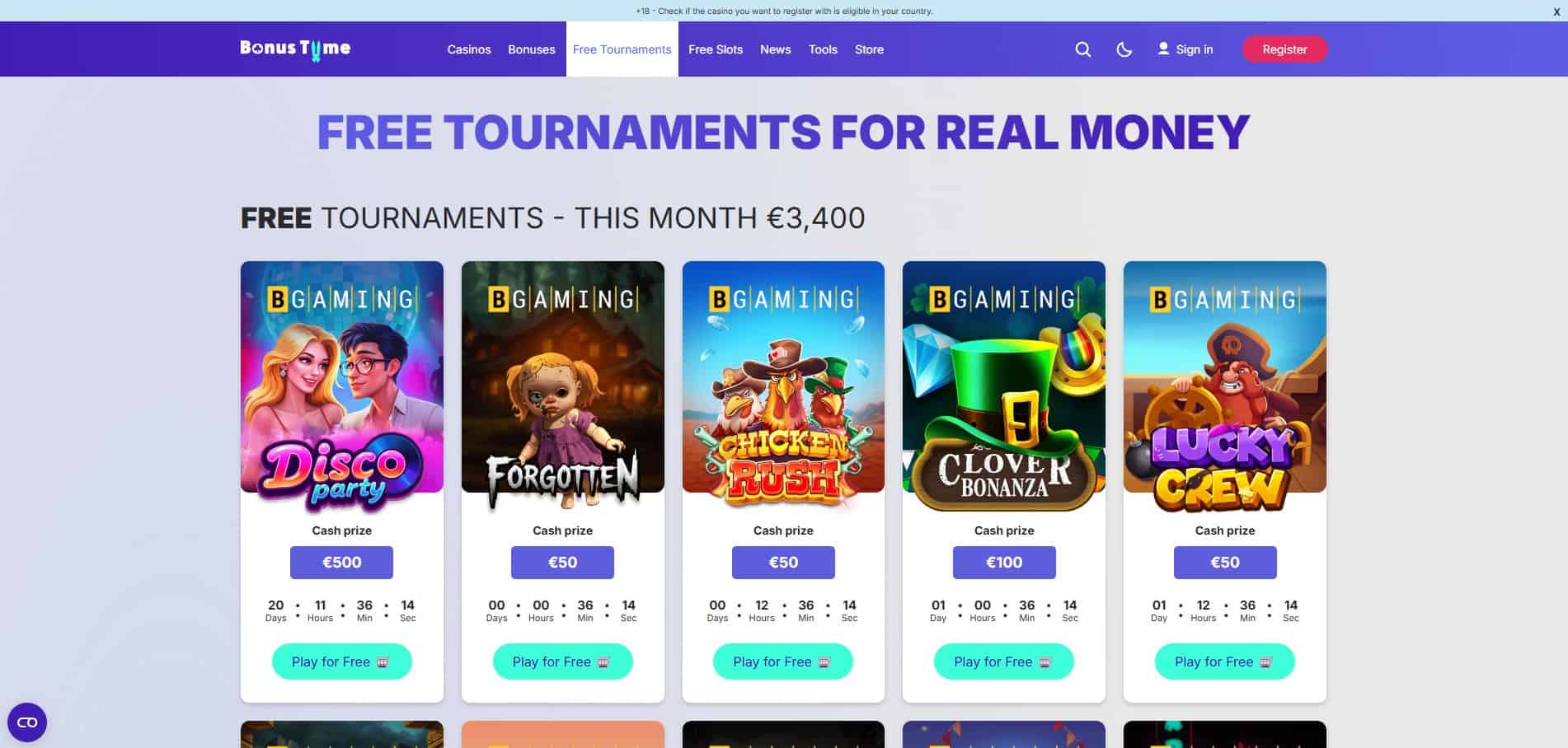 BonusTiime’s free tournaments are thrilling competitions designed for players to enjoy high-stakes excitement without entry fees. Participants can join these free casino games at no cost, competing for real cash prizes and exclusive rewards, making it a unique opportunity to win real money without spending a dime.